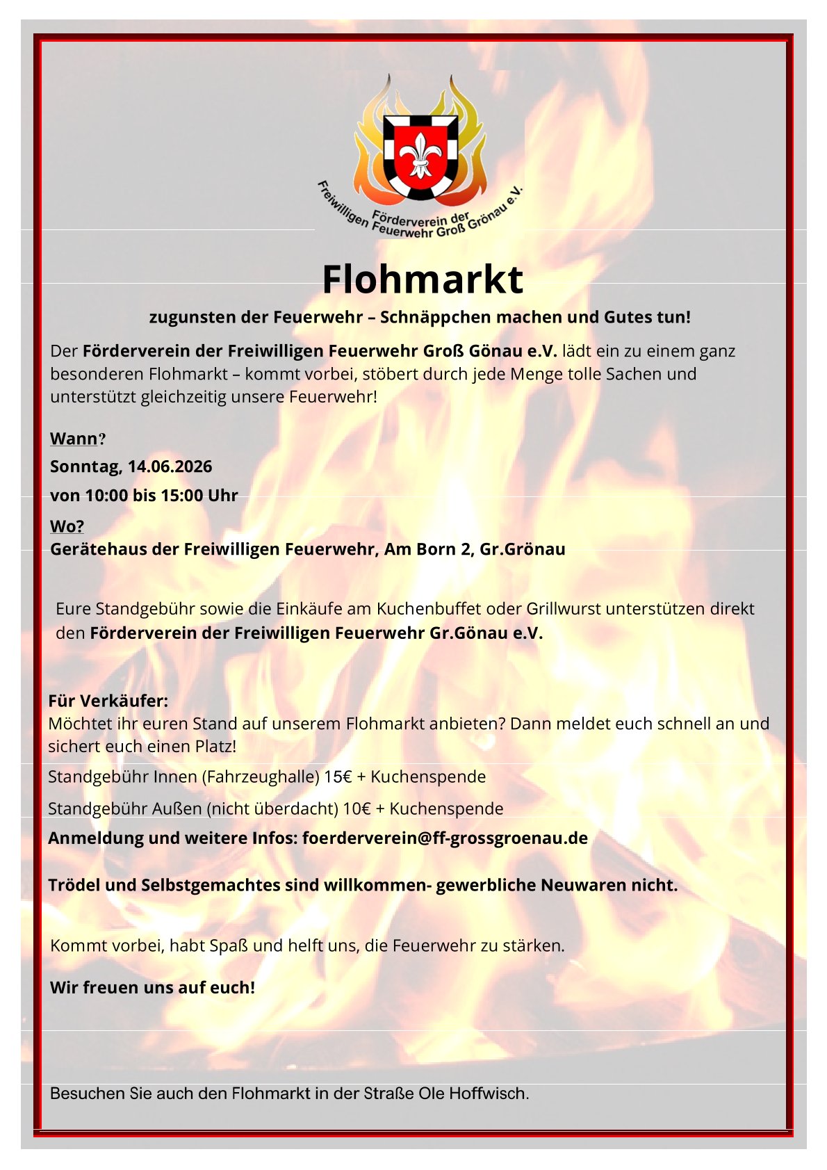 Der Förderverein der Freiwilligen Feuerwehr Groß Grönau e.V. lädt ein zu einem ganz besonderen Flohmarkt – kommt vorbei, stöbert durch jede Menge tolle Sachen und unterstützt gleichzeitig unsere Feuerwehr!